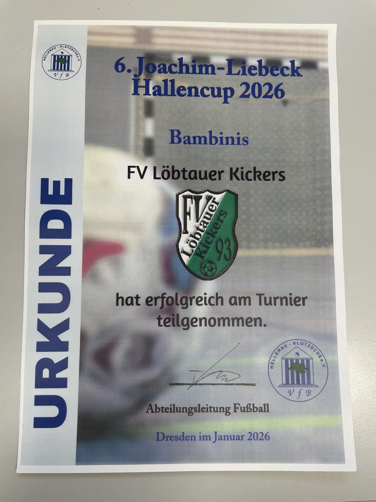 Am 25.01.26 machten sich fünf unserer Bambinis zur Sporthalle des Gymnasium Klotzsche auf, um am 6. Joachim-Liebeck-Hallencup teilzunehmen. Bei diesem hervorragend vorbereiteten Turnier waren, außer den Mini-Kickers, noch 17 weitere Mannschaften am Start.